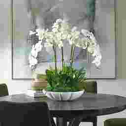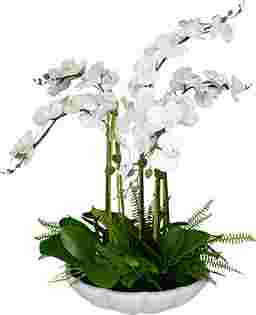 Delina is an absolute showstopper with gracefully arching stems of crisp white, real-touch orchids. Adding lush appeal is the bed of naturally preserved moss with boston fern accents, displayed in an elegant bowl crafted from ivory man-made stone that accurately replicates the look of Thassos marble.
