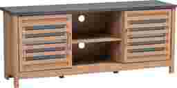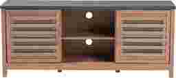 Contemporary, up-to-date, and spacious, its clean and linear shape keep your room looking neat. The Delmonte TV stand, with its two-tone finishing in stone-look up-surfaces and oak brown veneered surface bring comfort with relaxed warmth of its character into your home. Constructed of engineered wood for ultimate strength and sturdiness, the TV stand features two doors with clear glass for convenient storage of DVDs, games and other living room items. Two open compartments are ideal for your DVD or gaming consoles. Cable hubs at the rear feed through your wires without messy tangling. Light Dean oak finish complements a wide range of color schemes for timeless looks in your home. Customer assembly is required.