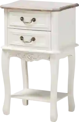 Heighten your bedroom with the beautiful Demille end table. Finished in white oak wood with white drawers. Place a lamp or alarm clock on top and store books or knick-knacks in the two drawers. Featuring molding detailing with an elegant brass metal handle on the drawers. Customer assembly is required