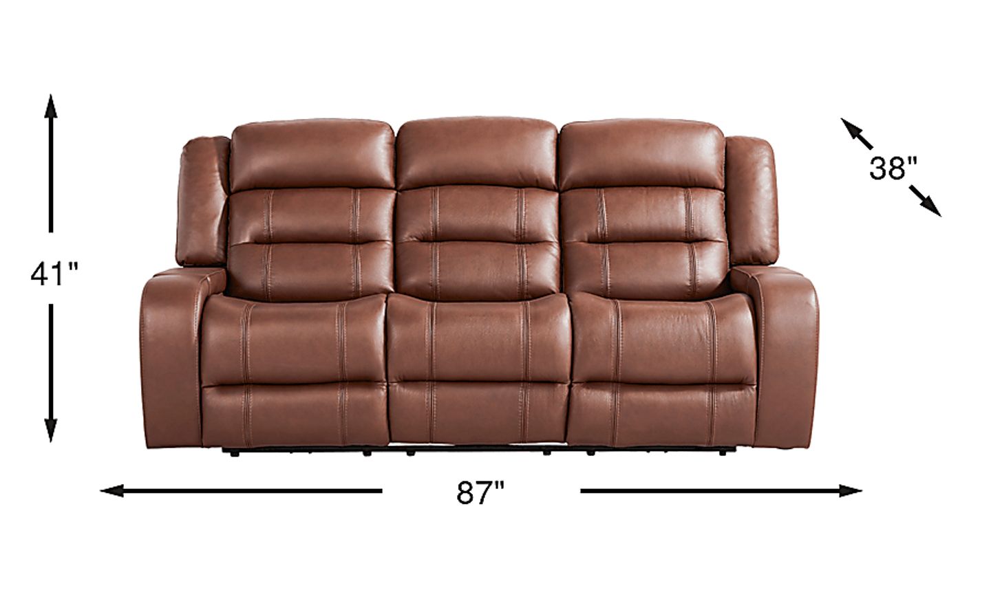 The Denali Brown Leather Reclining Sofa measures 87 inches wide, 38 inches deep, and 41 inches high, with a seat height of 19.5 inches. This standard sofa size comfortably seats three. When considering it for your space, particularly in Texas homes where living rooms vary, ensure to measure your room, doorways, and hallways to confirm it will fit and allow for its reclining movement.
