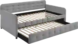 This transitional Densmore daybed features button tufting full-back, track arms, as well as a convenient roll-out trundle that can make full use of your space to offer extra space for smaller space. It is suitable for your guest room for sleepover guests, living room for extra sofa seating, and home offices for resting. Customer assembly is required.