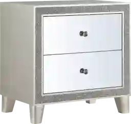 This modern glam style uses glitter trim, reflective surfaces, and metallic tone to brighten up your place. The Desiles champagne nightstand is adorned with eye-catching decorative accents like sparkling silver glitter trim and opulent champagne finish. It features self-closed drawer glide and felt-lined top drawer for safety and function. The mirrored finish applied on the drawer fronts creates a shiny and lustrous surface, gently reflecting light that passes through the room. The Desiles will bathe your room decor in glamorous luster and elegant glow. Customer assembly is required.