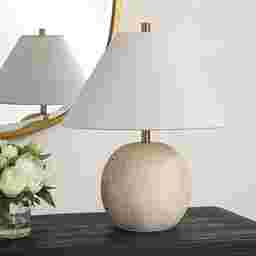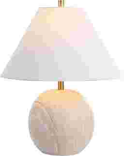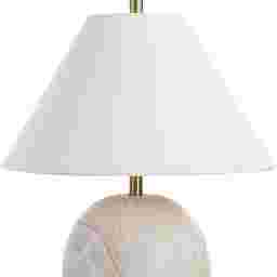 The unique shape of the Desoto Lake Beige Lamp is enhanced with the luxurious look of marble. The design is achieved through a process called water marbling and each piece will have its own unique design. Neutral tones throughout are complemented with accents finished in a soft gold. Topped with a coolie hardback shade in crisp white linen fabric, this lamp will illuminate your space with a warm, inviting glow. Partial assembly may be required.