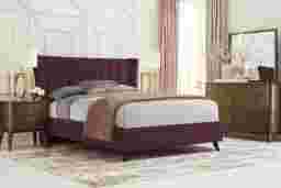 Boost the look of your space with the mid-century modern style of the Devon Loft bedroom collection accompanied by the extravagance of the Nanton Park king bed. Upholstered in plush red velvet, the headboard features a gorgeous wingback style complete with vertically tufted channels. This suite's dresser and mirror are crafted from poplar and pine solids with walnut veneers in a rich brown finish. The dresser features English and French dovetail joints for greater strength and longevity. Mattress and foundation (if required) sold separately.
