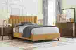 Devon Loft Walnut 5 Pc Bedroom with Nanton Park Yellow Queen Upholstered Bed