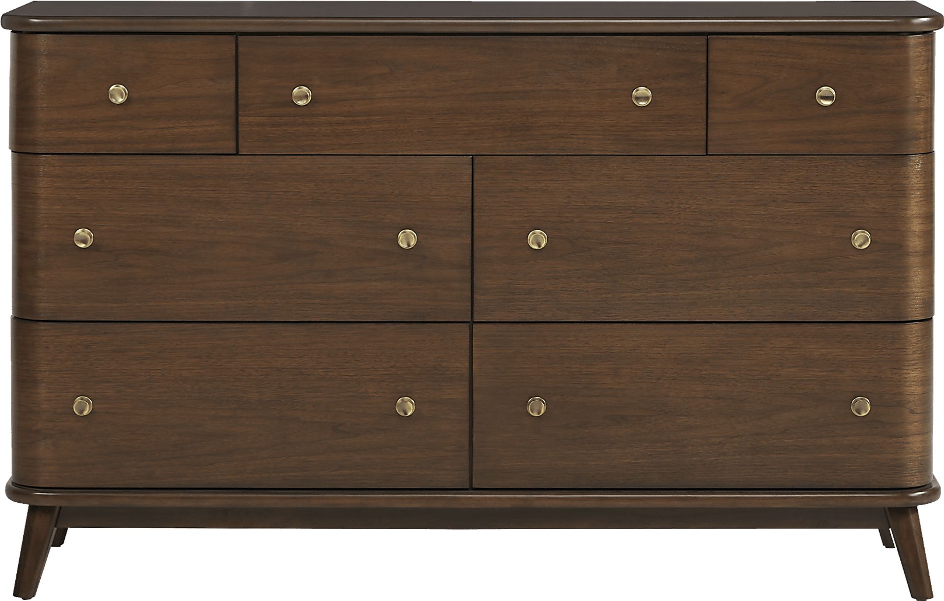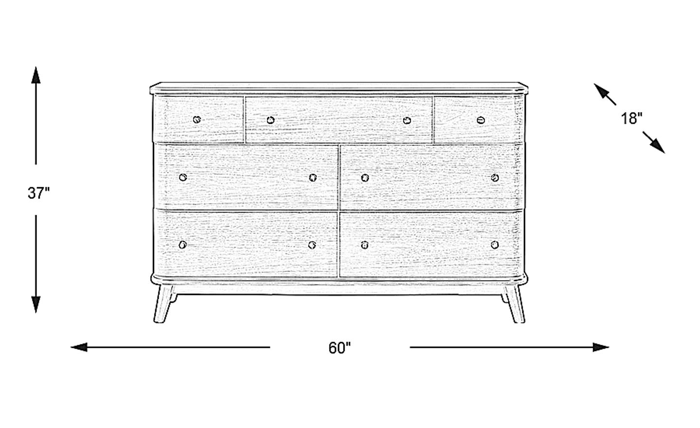A bedroom essential, the Devon Loft dresser provides storage with style. Rounded edges and angled legs lend a sophisticated mid-century modern aesthetic, while seven roomy drawers provide ample space for clothing and accessories. Each drawer is made with English and French dovetail joints for long lasting strength and durability. The dresser is made with poplar and pine solids with walnut veneers in a rich walnut finish.