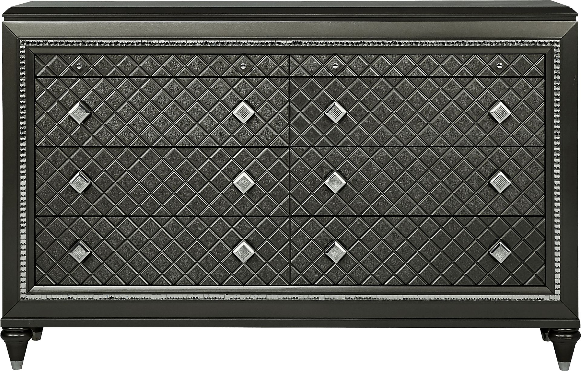 Beautiful diamond patterned embossing on the six spacious drawers with an additional two jewelry trays give this dresser an elegant and chic appearance. Diamond shaped chrome finished hardware pulls with inlaid rhinestones add a flair to contrast the metallic gray finish of the wood solids. English dovetail joints on the drawers create a sturdy storage space.