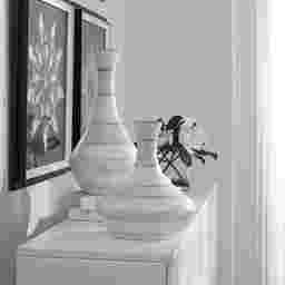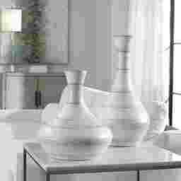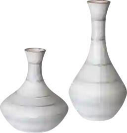 These vases feature a handcrafted fluted design with a multi-tone glaze in ivory, blue, and tan. Unlike mass-produced items, the hand-glazing process creates subtle variations in color and texture, giving each set a unique, artisan character. This glazed finish not only enhances the transitional aesthetic but also creates a non-porous protective barrier that helps the material resist UV fading and moisture absorption.