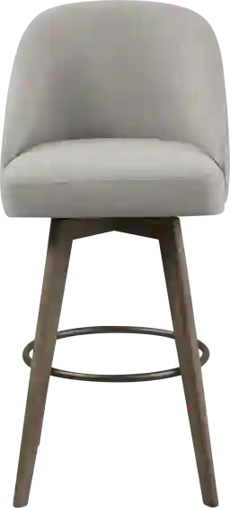 Beautifully crafted, the Dinmore bastool with swivel seat introduces a perfect blend of simplicity and sophistication. This barrel style counter stool features a swivel function, allowing you to easily rotate the rectangular seat. Soft gray upholstery and a smooth reclaimed gray finish on the rubber wood legs create a clean transitional look, while a matte silver metal ring provides the perfect footrest. The smooth and graceful curves of this counter stool form an elegant silhouette that adds a handsome touch to your dining room. Customer assembly is required. Max weight capacity: 300 lbs.