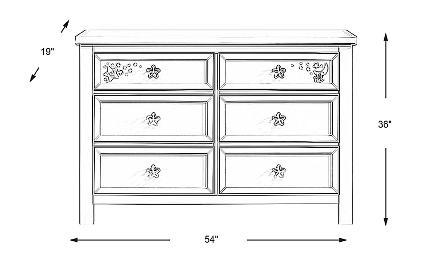 Bring functional storage space and beautiful looks to your child's bedroom with the Starry Dreams with Mickey Mouse dresser. Six spacious drawers feature custom brushed nickel star pulls and provide plenty of room for clothing, school supplies and much more. Crafted of hardwood solids, this piece comes in a painted gray finish that blends well with a wide range of styles. Included is a removeable art panel that features a fun, peaceful depiction of Mickey Mouse gazing at the stars.