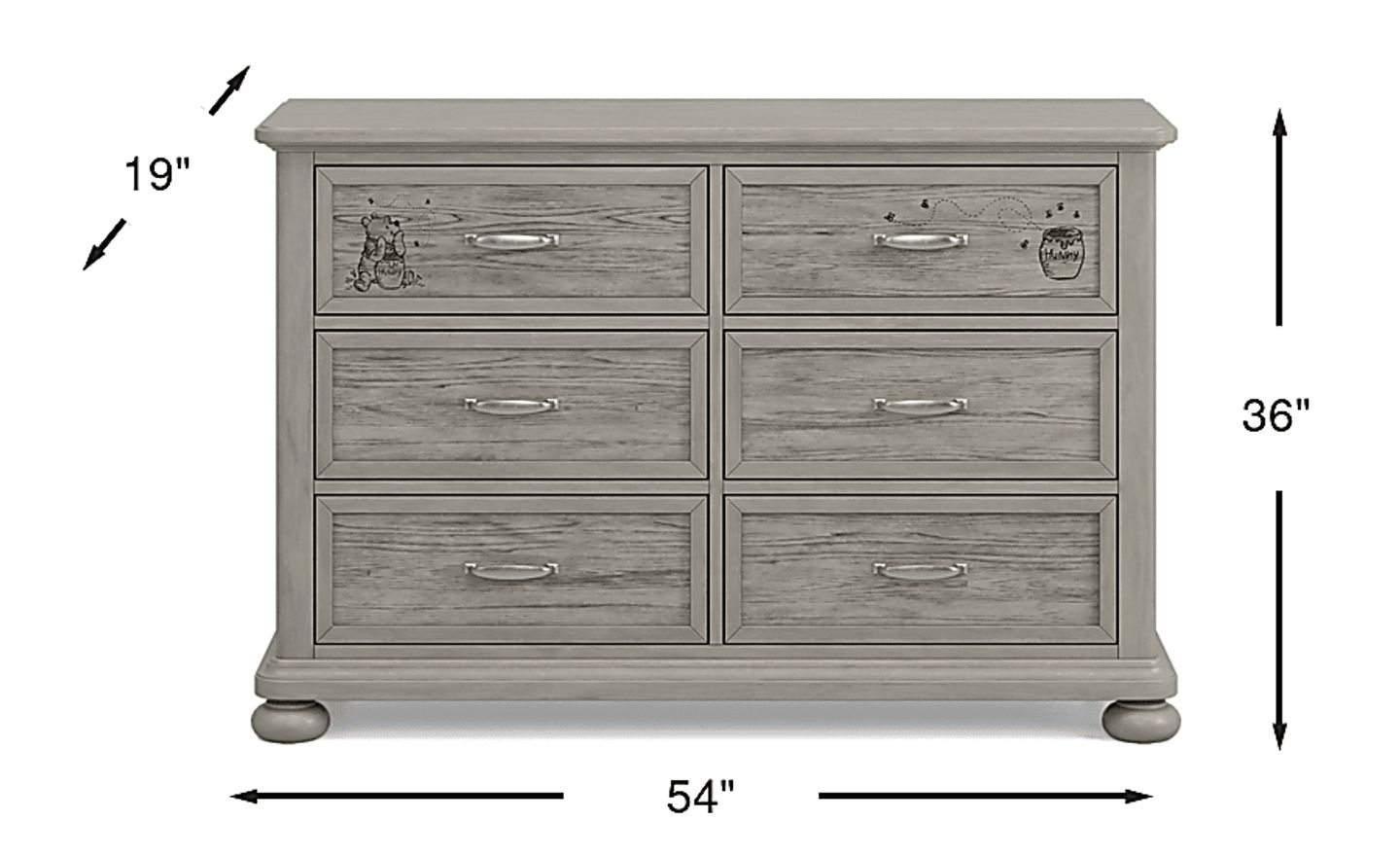 The Woodland Adventures with Winnie the Pooh dresser provides plenty of room to keep your little one's essentials. Featuring six dovetail drawers with decorative molding frames around the fronts and ball bearing glides, you can easily store clothing, school supplies and more. Crafted of hardwood solids with elm veneers, this piece comes in a multi-step classic gray stained finish that is pleasing to the eye. Included is a removable art panel which features comforting illustrations of Winnie the Pooh and Friends.