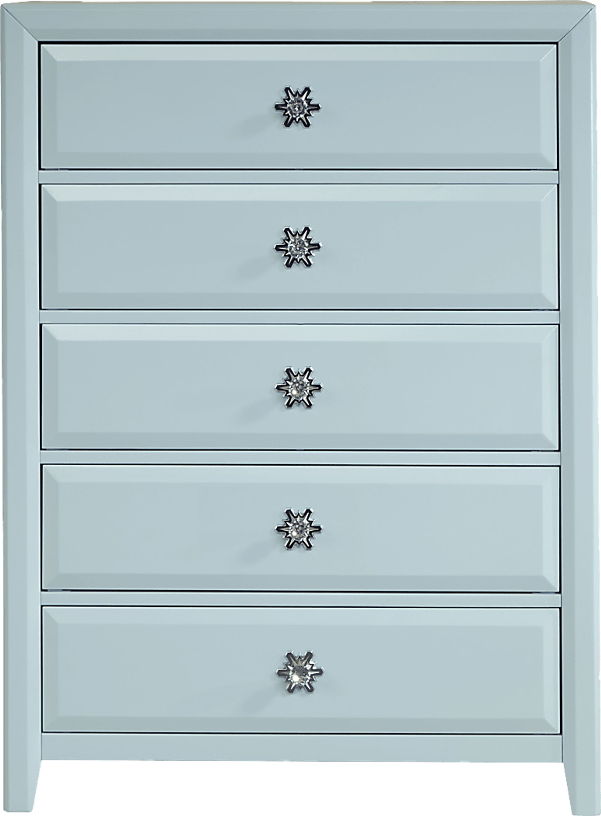 Make your child's bedroom more enchanting with the shimmering Disney Frozen chest in Ice Blue. Chrome recreations of snowflakes and acrylic crystal knobs highlight the exterior front panels of the five-drawer chest. Internally, the chest is configured with French dovetails to provide support against any feisty pulls from your child.
