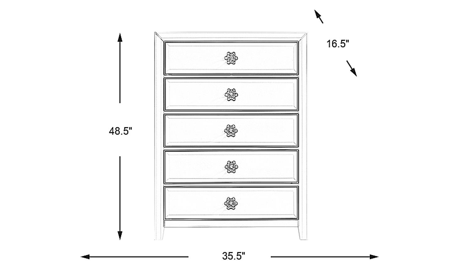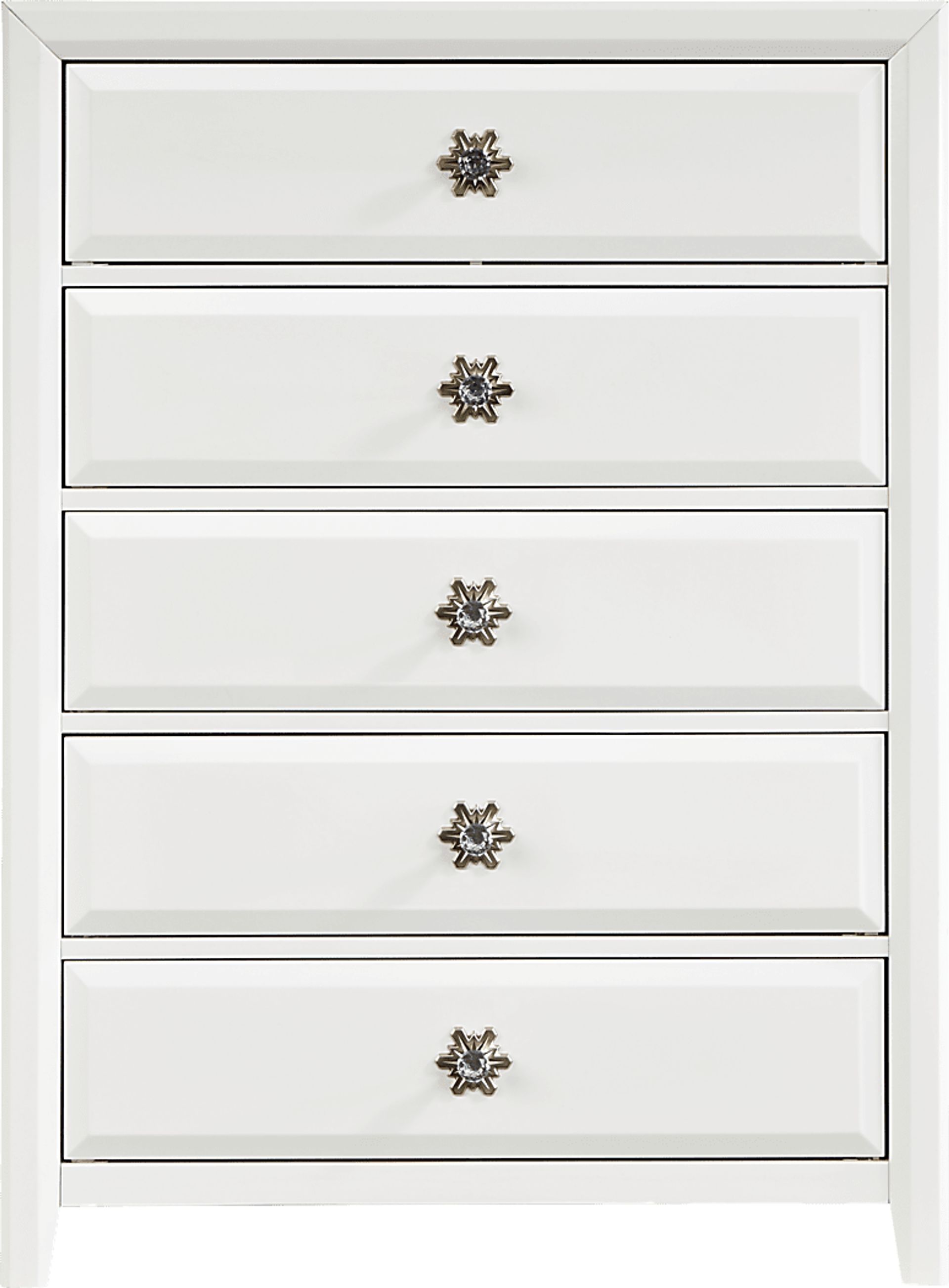 Cast an enchanting spell over your child's bedroom with the shimmering Disney Frozen chest in ice white. Chrome recreations of Elsa's Signature Snowflake and acrylic crystal knobs highlight the exterior front panels of the five-drawer chest. Internally, the chest is configured with French dovetails to provide support against feisty pulls from your child.