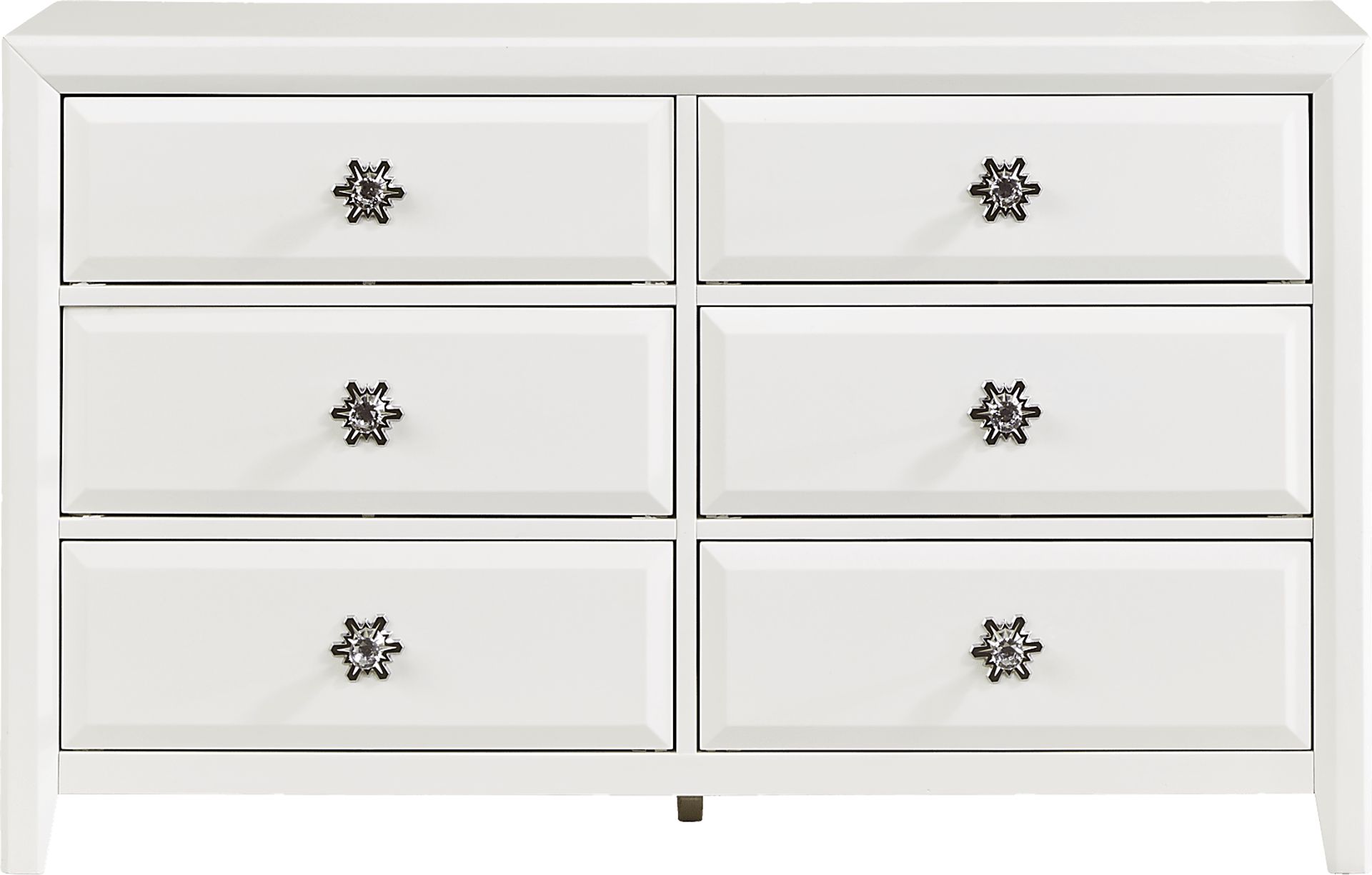 Make your child's bedroom more enchanting with the shimmering Disney Frozen dresser in Ice White. Chrome recreations of snowflakes and acrylic crystal knobs highlight the exterior front panels of the six-drawer dresser. Internally, the dresser is configured with French dovetails to provide support against any feisty pulls from your child.