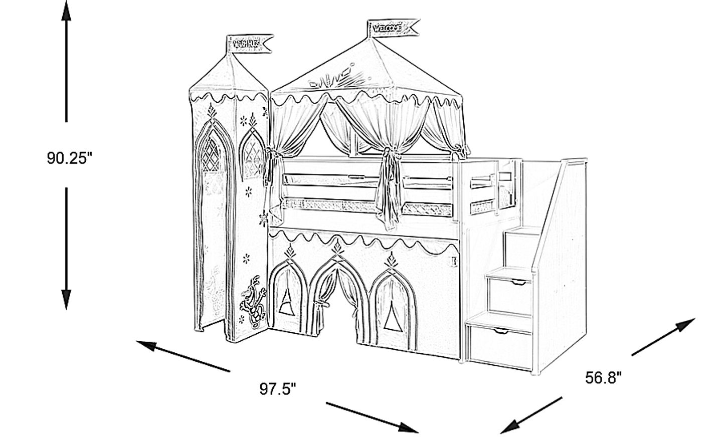 With everything they need for frosty fun, the Disney Frozen twin loft bed makes your child's room an enchanting wonder. Crafted in a finish as white as snow, the frame has storage steps for easy climbs to the twin bed on top and an activity panel with a magnetic dry-erase board. Your child will love assembling the Velcro snowman featuring felt-back pieces that attach to the tower curtains. The tower curtains are designed with imagery evoking a flurry of snowflakes, alongside the Arendelle crocus flower above arched doors and windows. With plenty of room for play and pretend, the underside of the low loft is hidden by a curtain that echoes the design of the tower. A canopy tent over the top loft welcomes imaginative dreams for the perfect final touch. Mattress and foundation sold separately. This product requires a bunkie board (sold separately).