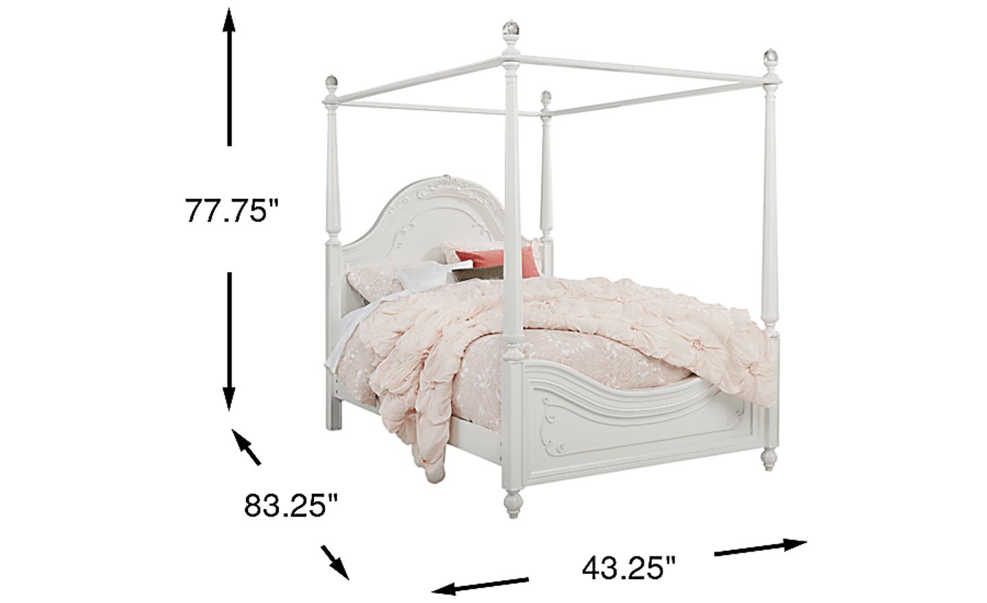Bedtime is fit for royalty thanks to the gorgeous Disney Princess Canopy bed. Perfectly designed with a swirling ribbon motif and acrylic crystal finials topping each of the four posters, your little girl will adore this regal bed. Made of wood solids with birch veneers in a sparkling white finish, this bed is the perfect way to settle down at the end of a long day of adventure. Mattress and foundation (if required) sold separately. Bed shown is full size.