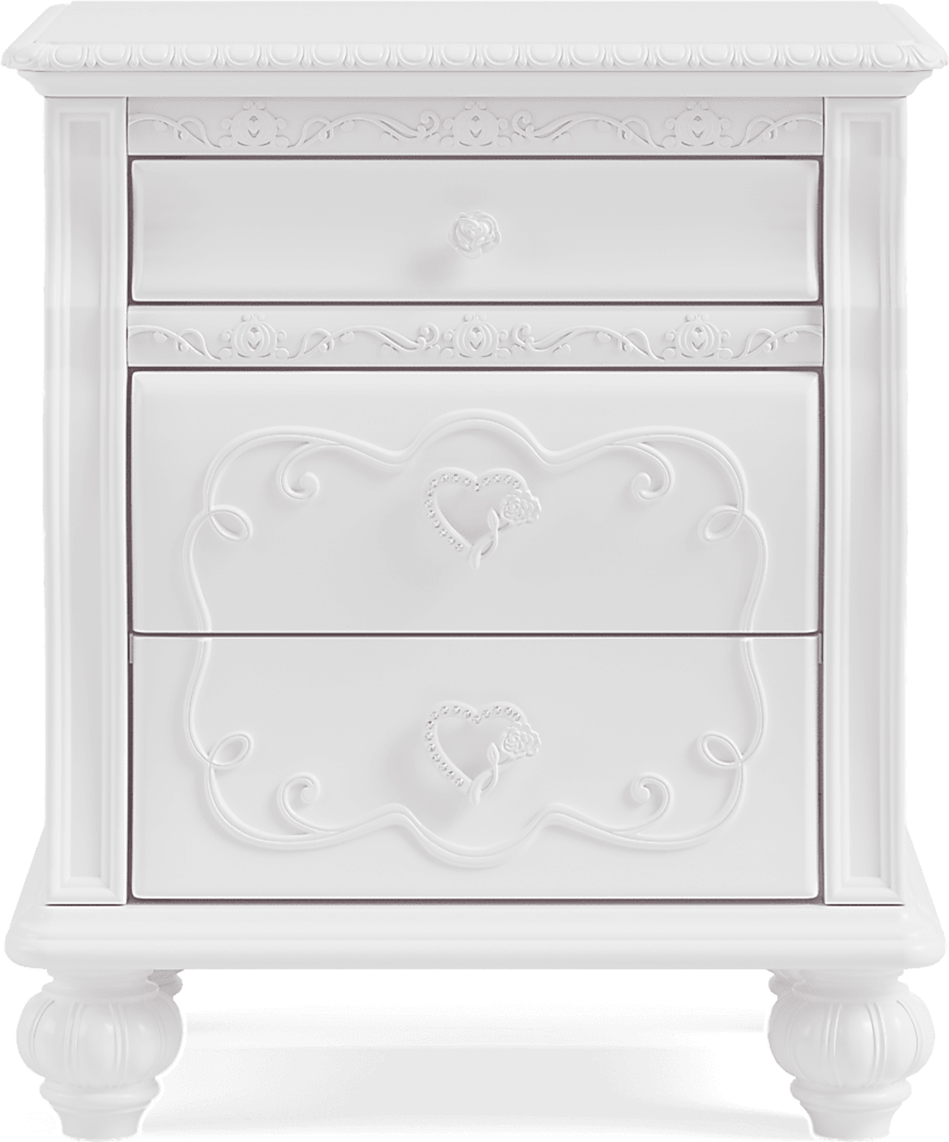 Perfect for bedside storage of her favorite fairy tales and treasures, the Princess Dreamer nightstand keeps everything close at hand. This nightstand is made of wood solids with birch veneers in a sparkling white finish that's sure to keep your very own princess happy. The ribbon design detail, inlaid crystalline bead feature and acrylic crystal heart-shaped pulls on the drawers will always make her feel like a princess.