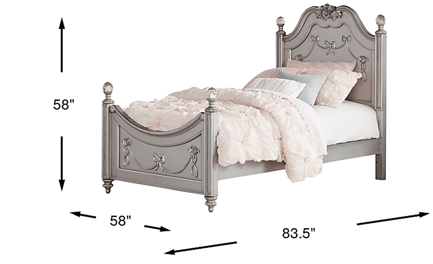 Designed to appeal to the inner princess in any girl, the Disney Princess poster bed is exquisitely detailed. Each post is adorned with sparkling acrylic crystal finials at the top, and elegant fluted spool feet at the bottom of the footboard. Adding a sweetly feminine touch, bows and roses decorate the headboard and footboard. A high/low bed locking system allows the bed height to grow with your child, or accommodates a trundle (sold separately) or under bed storage. Crafted from poplar solids, the pretty platinum finish adds sophistication to this already stunning bed. Mattress and foundation (if required) sold separately. A bunkie board is recommended for this product.