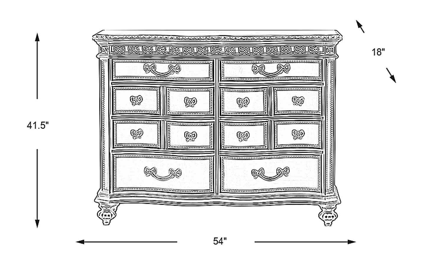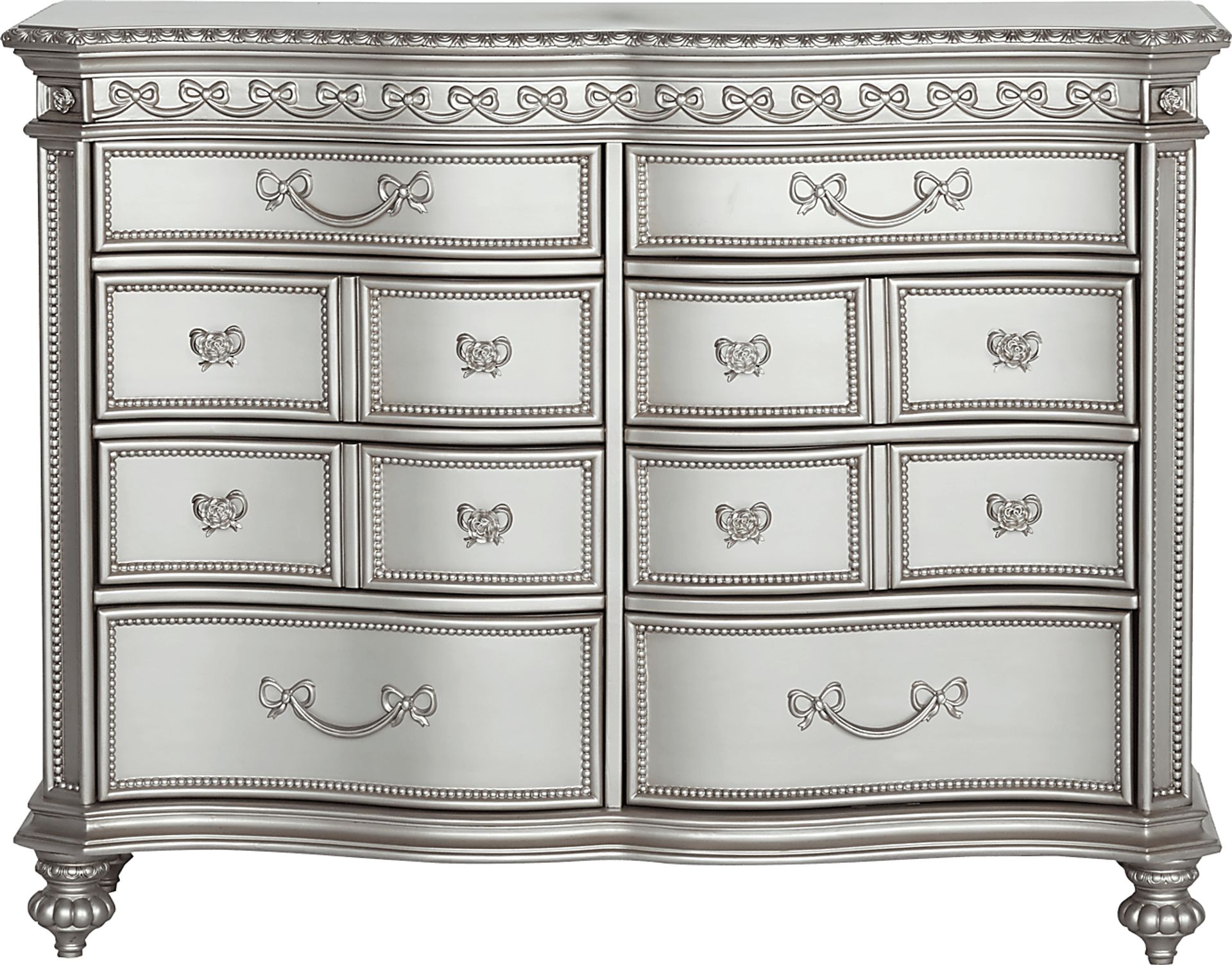 An enchanting place to store clothing, the Disney Princess dresser has curved drawer fronts and custom bow and rose hardware. Crafted from poplar solids, a pretty platinum finish is beautifully detailed with beading, decorative bows, and elegant fluted spool feet. Eight variously sized drawers make it an ideal home for small and large wardrobes alike. Featuring felt-lined upper drawers, dust-proofing along the bottom drawers and French and English dovetailing for stability, this dresser is not only beautiful but functional, too. Sophisticated and feminine, the timeless look easily grows with your child.