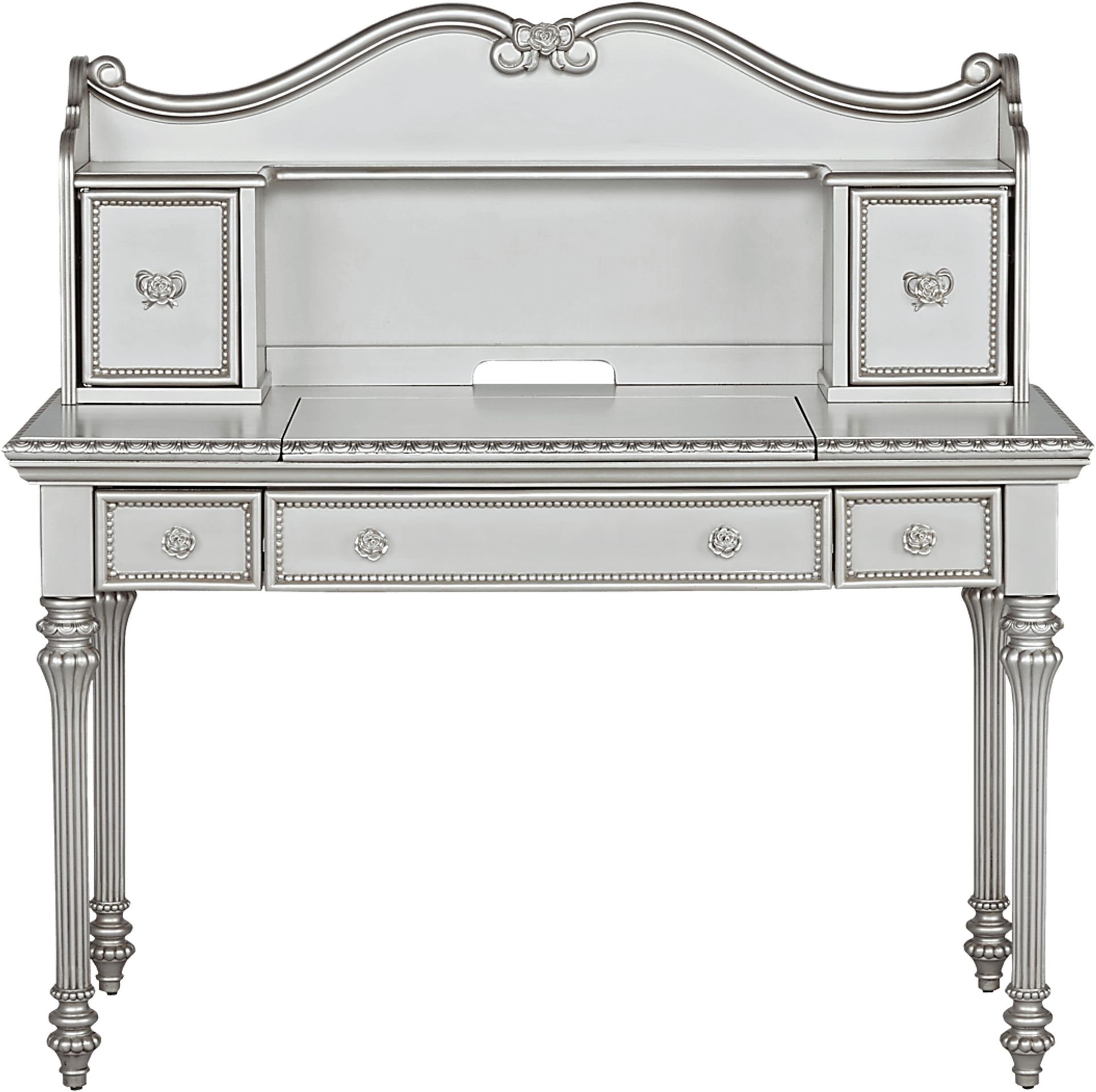 Beautifully detailed, the Disney Princess vanity desk and hutch is a pretty and functional workspace. It can be used as a traditional study surface or, with its lift up mirror (on the center) it instantly becomes a vanity; when the mirror is in the open position you'll find a felt lined storage area perfect for keeping little treasures safe. Featuring a platinum finish, the desk has a drop down keyboard tray, two storage drawers, custom rose shaped drawer pulls and fluted legs. The hutch has a long shelf and a cubby behind each door, as well as a pass through hole on the back, which makes it easy for a phone or laptop to gain access to a wall outlet.