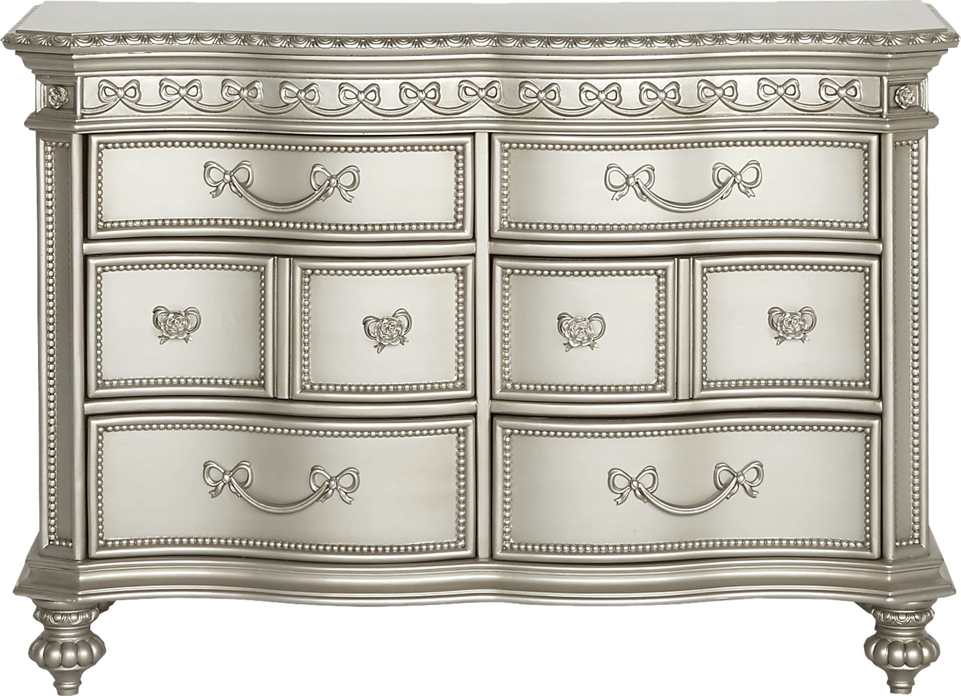 An enchanting place to store clothing, the Disney Princess dresser has curved drawer fronts and custom bow and rose hardware. Crafted from poplar solids, a pretty silver finish is beautifully detailed with beading, decorative bows, and elegant fluted spool feet. Six variously sized drawers make it an ideal home for small and large wardrobes alike. Featuring felt-lined upper drawers, dust-proofing along the bottom drawers and French and English dovetailing for stability, this dresser is not only beautiful but functional, too. Sophisticated and feminine, the timeless look easily grows with your child.