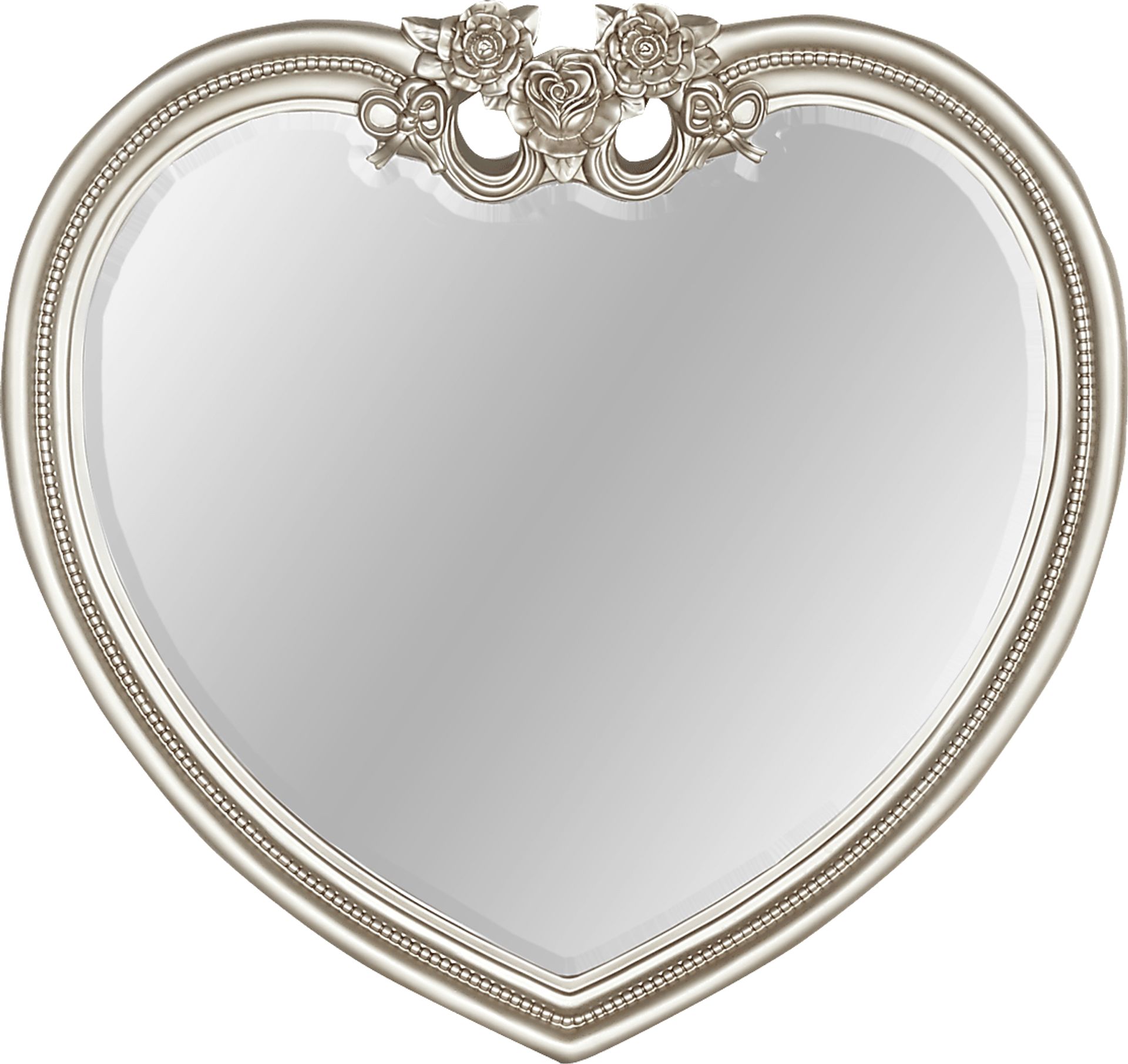 Behold the fairest one of all in the enchanting heart shaped Disney Princess mirror. Crafted from poplar solids, the beveled glass is framed by a pretty silver finish. The mirror features beaded trim, intricate roses, and cute bows, all with brushed metallic effect.