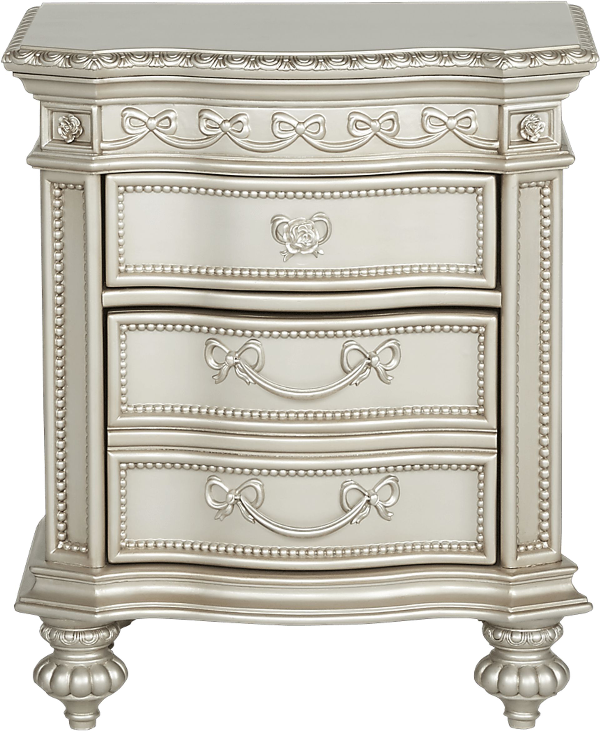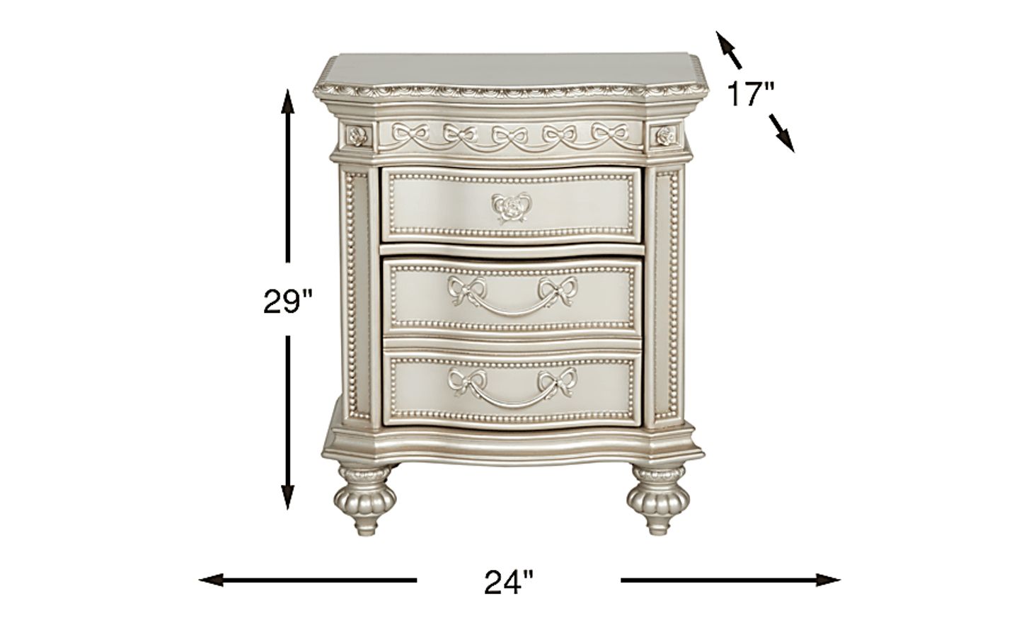 An ideal bedside companion, the Disney Princess nightstand is an excellent place to store necessities nearby. A felt-lined upper drawer, a dust-proofed lower drawer, and French and English dovetailing make this piece not only pretty, but functional as well. The smooth top makes a lovely home for a framed picture or alarm clock, while the two variously sized drawers are great for storing a book or other odds and ends neatly out of sight. Crafted from poplar solids and maple veneers, a sophisticated silver finish complements the custom rose and bow hardware and detailing. Elegant fluted spool feet and curved drawer fronts round out this pretty piece.