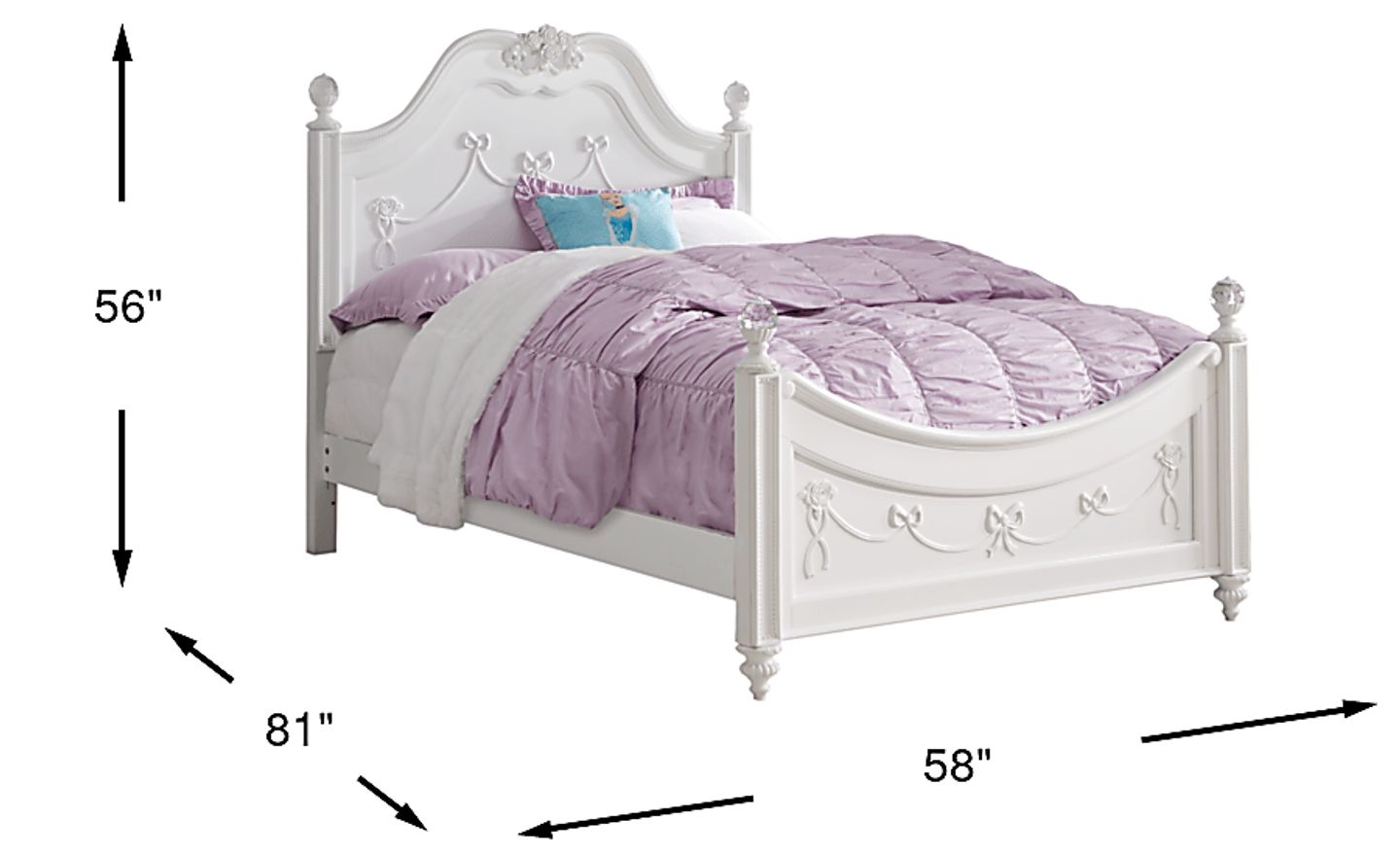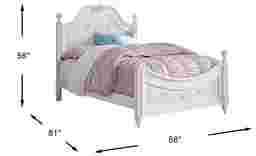 Designed to appeal to a young girl's inner princess, the poster bed is exquisitely detailed. Posts are adorned with sparkling crystal finials and fluted spool feet. Curved head and footboard feature lovely ribbons and bows ornamentation. High/low bed locking system allows bed height to grow with your child, or accommodates a trundle or under bed storage. (Trundle sold separately) Mattress and foundation (if required) sold separately. Bed shown is twin size.