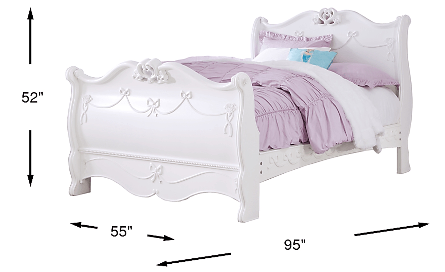 Encourage fairy tale dreams by tucking your little girl into the heavenly Disney Princess sleigh bed. Crafted with an antiqued white finish, the bed offers intricate detailing. Extensive roses, ribbons and bows ornamentation, with a subtle brushed metallic effect, embellish the shaped headboard, footboard and rails. High/low bed locking system allows bed height to grow with your child, or accommodates a trundle or under bed storage. (Sold separately) Mattress and foundation (if required) sold separately.