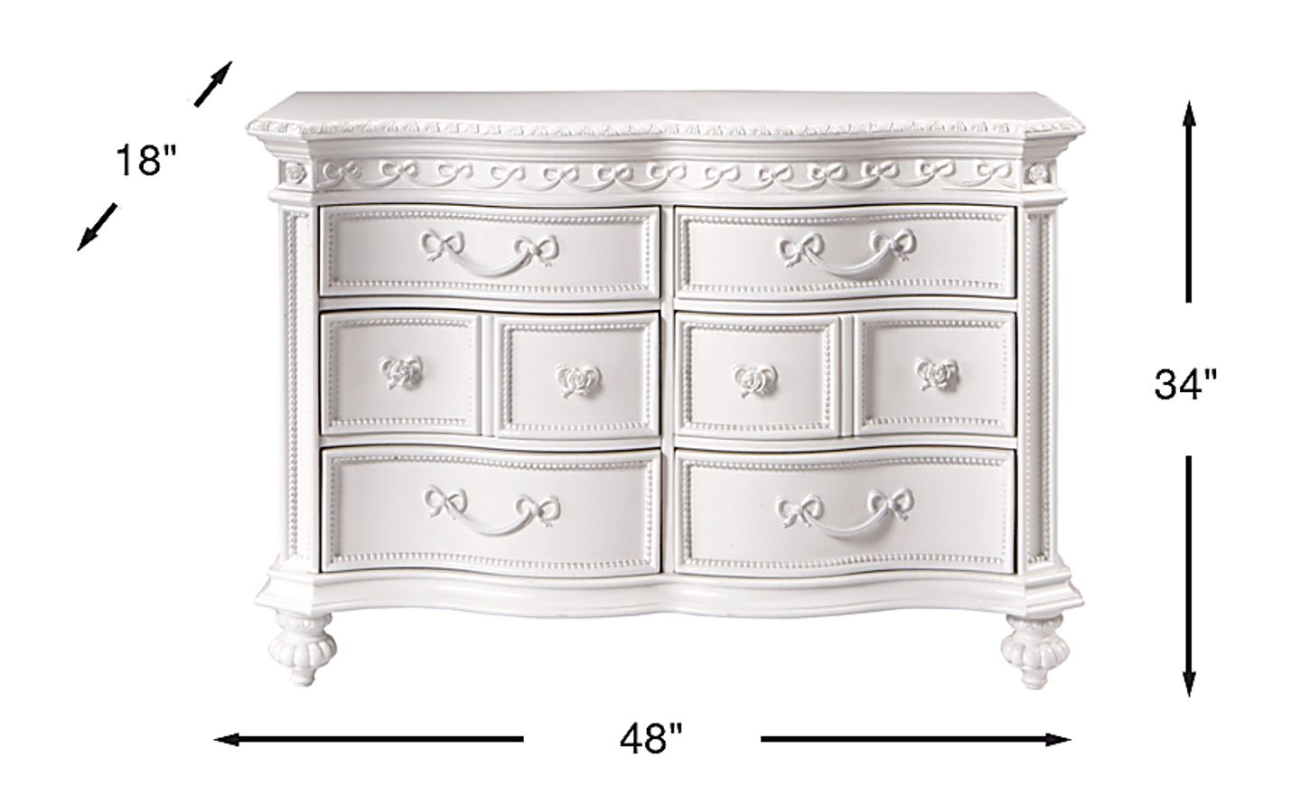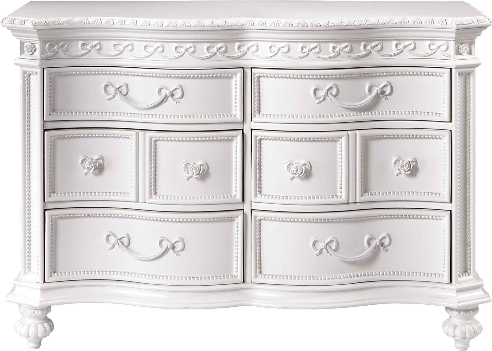 An enchanting place to store clothing, this dresser has curved drawer fronts and custom hardware. Antiqued white finish is beautifully detailed with beading, bows and fluted spool feet. Felt-lined top drawers protect delicates.