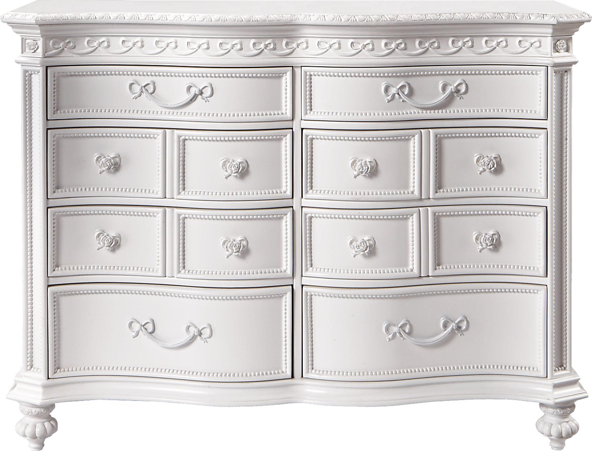 As generously proportioned as it is detailed, this lovely dresser provides maximum storage. Top drawers are felt-lined and all drawers have curved fronts. Custom rose and bows hardware is the perfect accent to the antiqued white finish.