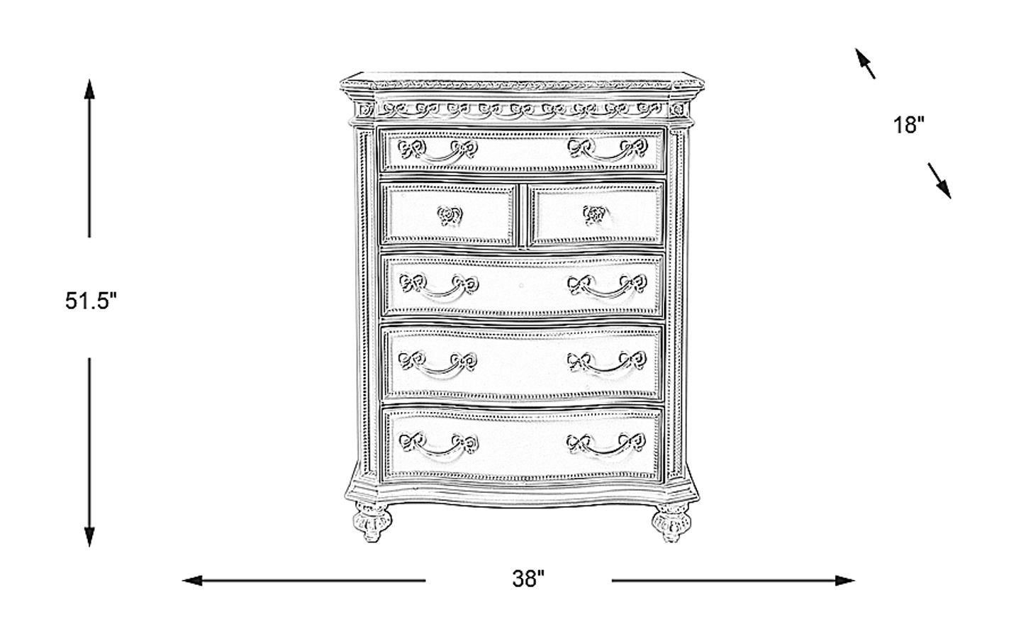 A beautiful piece, this chest has an antiqued, rubbed white finish and exquisite ornamentation. Curved drawer fronts and fluted spool feet offer feminine appeal. Felt-lined top drawer protects delicate items.