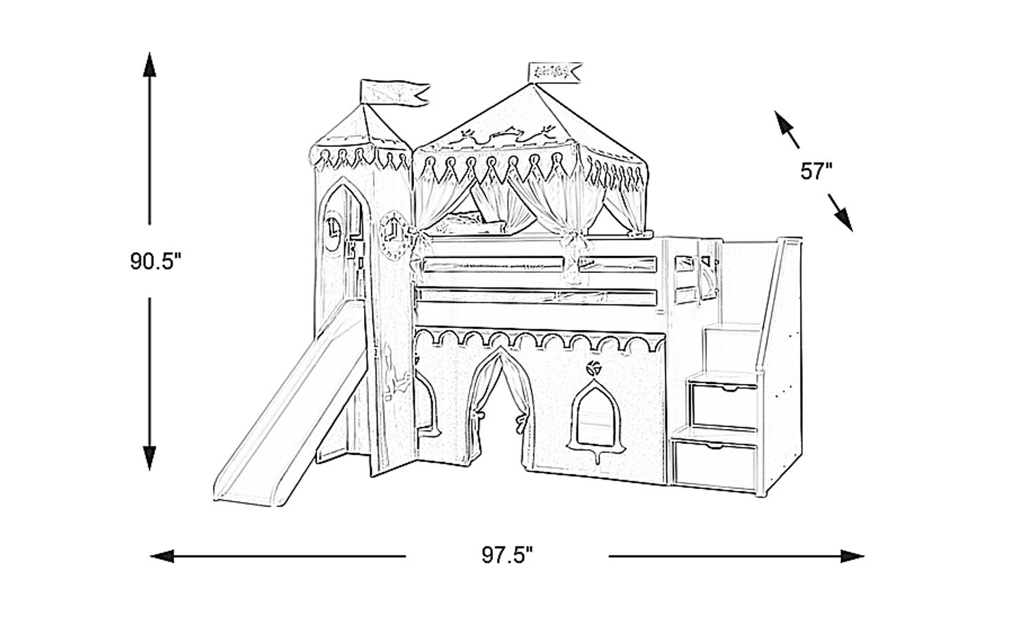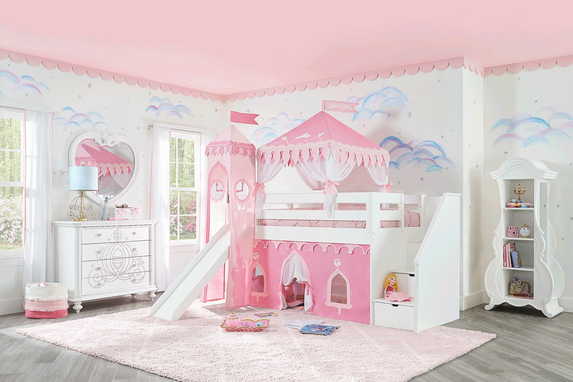 Tuck your child into the bed of their dreams with the Fairytale loft bed from our Disney Princess collection. This adorable loft features a beautiful white finish and a pink tent underneath and above to help your little feel like royalty. This bed comes complete with a slide, tower attachment and storage steps. Twin mattress and foundation (if required) sold separately.