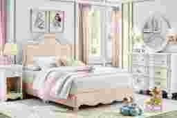 Create a fairytale escape for your little royal with the Disney Princess collection, where every night feels like a bedtime ball and every morning begins a brand-new adventure. Featuring blushing pink velvety fabric and a headboard embellished with scalloped edges and delicate gold embroidered heart and bow ribbon details, this dreamy bed is sure to be the centerpiece of any princess's room. Pumpkin-style feet add storybook charm to its low-profile frame, grounding the look with cozy appeal and easy access for little ones. Mattress and foundation (if required) sold separately.
