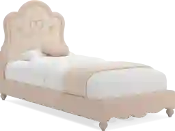Create a fairytale escape for your little royal with the Disney Princess collection, where every night feels like a bedtime ball and every morning begins a brand-new adventure. Featuring blushing pink velvety fabric and a headboard embellished with scalloped edges and delicate gold embroidered heart and bow ribbon details, this dreamy bed is sure to be the centerpiece of any princess's room. Pumpkin-style feet add storybook charm to its low-profile frame, grounding the look with cozy appeal and easy access for little ones. Mattress and foundation (if required) sold separately.