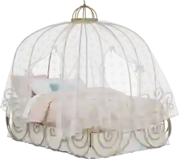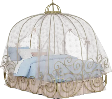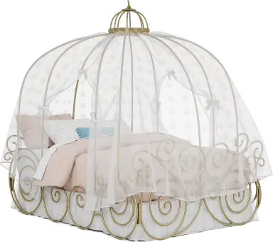 Create a fairytale escape for your little royal with the Disney Princess collection, where every night feels like a bedtime ball and every morning begins a brand-new adventure. Styled after Cinderella's iconic carriage, this bed features a beautifully sculpted gold color metal frame, complete with swirling scrollwork, heart accents and a golden crown finial at the top. The sheer canopy, with a dusting of delicate sparkle, and matching bed skirt set the stage for play, rest or pretend. Includes bed skirt. Mattress and foundation (if required) sold separately.