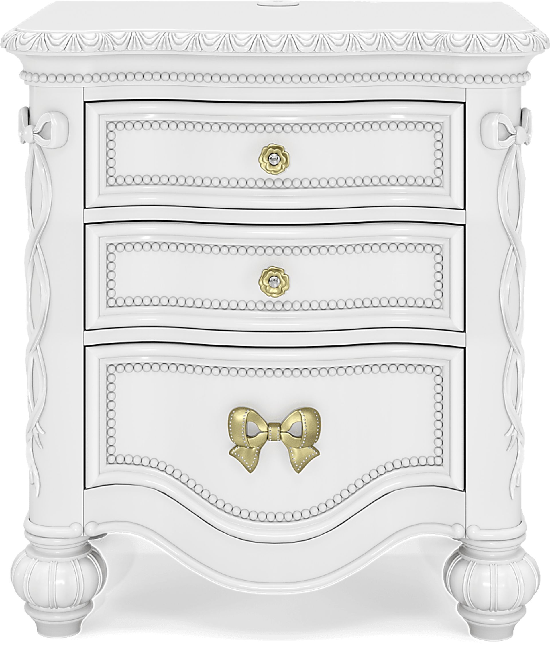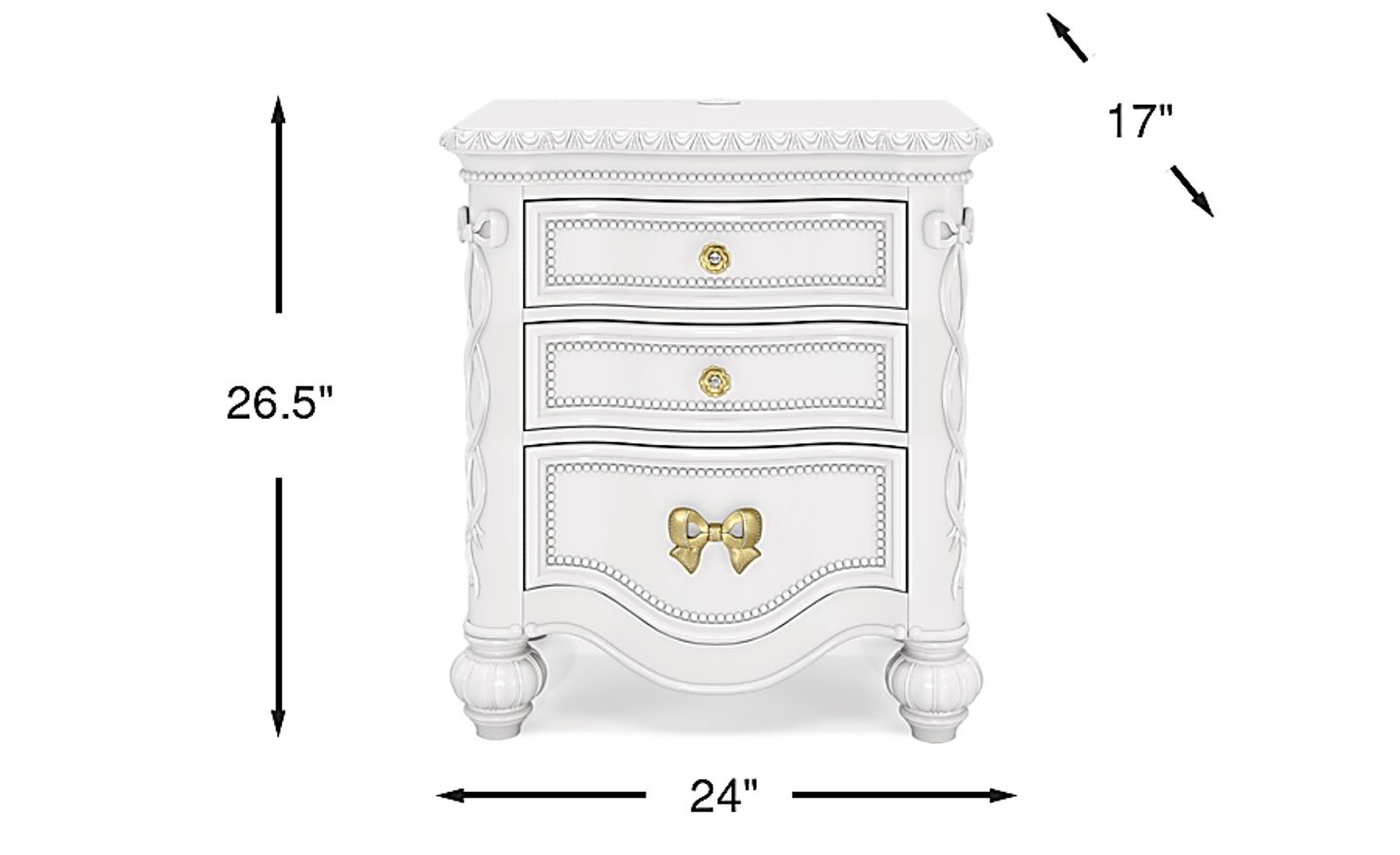 Create a fairytale escape for your little royal with the Disney Princess collection, where every night feels like a bedtime ball and every morning begins a brand-new adventure. With three spacious drawers and a gently curved silhouette, this nightstand offers a generous amount of storage for bedside essentials, accessories and more. Sparkle white finish highlights the gold bow and rose drawer pulls, complete with faux crystal insets. Each drawer box is equipped with soft-close glides and features French dovetail fronts and English dovetailing in back for ease of use and enhanced durability. Pink felt-lined top drawers and built-in dual USB ports are just two more exciting features that blend everyday convenience with princess-worthy charm.