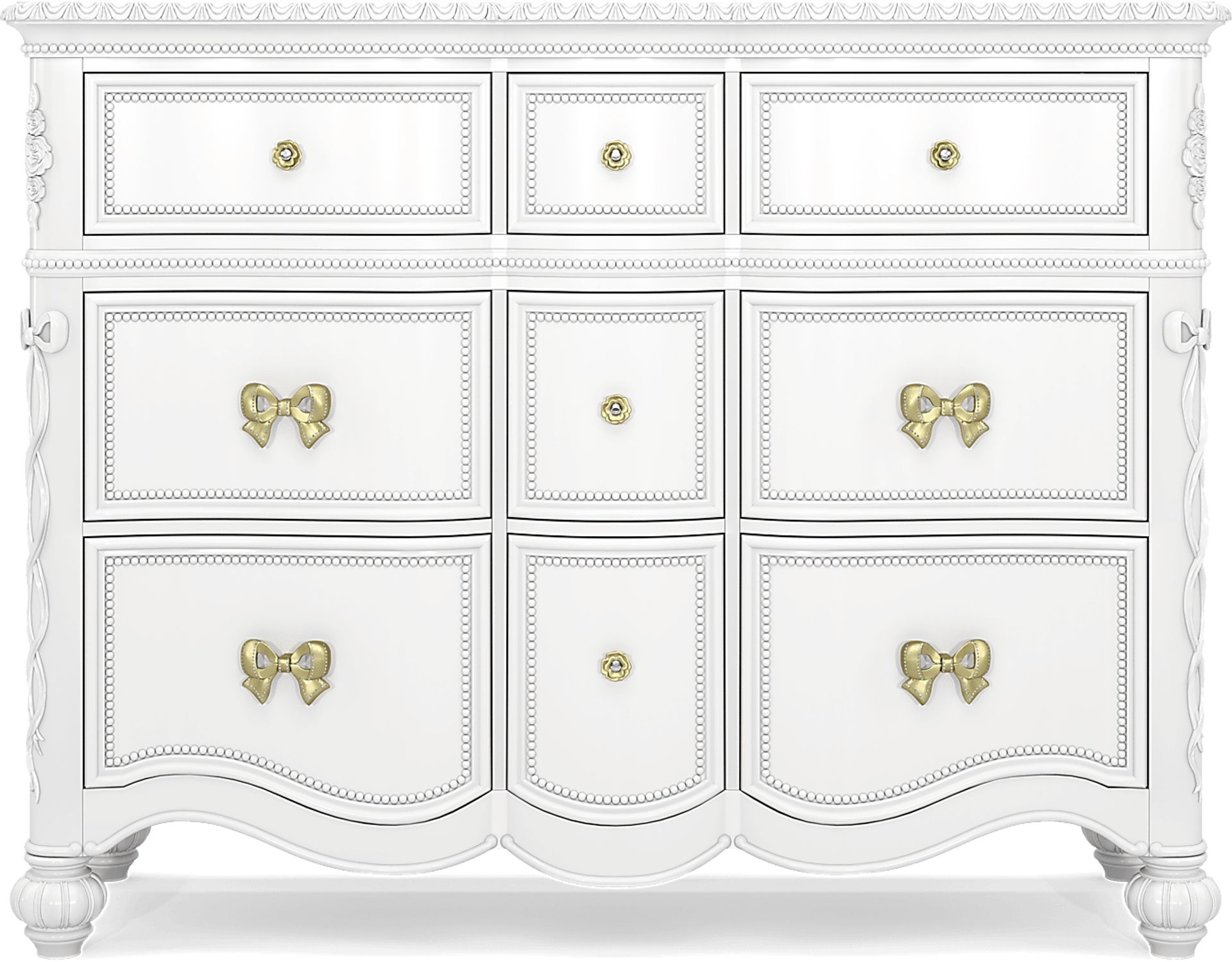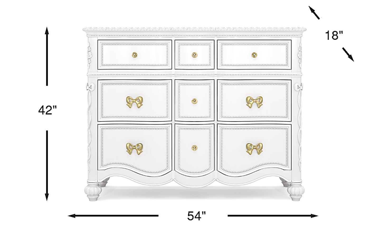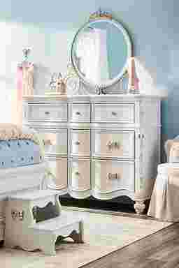 Create a fairytale escape for your little royal with the Disney Princess collection, where every night feels like a bedtime ball and every morning begins a brand-new adventure. With nine spacious drawers and a gently curved silhouette, this dresser offers a generous amount of storage for clothing, accessories and more. Sparkle white finish highlights the gold bow and rose drawer pulls, complete with faux crystal insets. Each drawer box is equipped with soft-close glides and features French dovetail fronts and English dovetailing in back for ease of use and enhanced durability. Pink felt-lined top drawers and built-in power outlets are just two more exciting features that blend everyday convenience with princess-worthy charm.