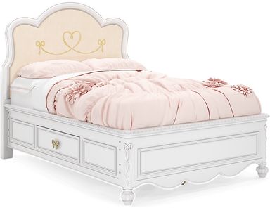 Create a fairytale escape for your little royal with the Disney Princess collection, where every night feels like a bedtime ball and every morning begins a brand-new adventure. Featuring blushing pink velvety fabric and a headboard embellished with scalloped edges and delicate gold embroidered heart and bow ribbon details, how could any growing princess resist the precious bed at the heart of this room? Pumpkin-style feet add storybook charm to its low-profile frame, grounding the look with cozy appeal. The coordinating 6-drawer dresser features gold bow and rose drawer pulls with crystal insets, soft-close glides, pink felt-lined top drawers, and built-in outlets. The matching LED-lit carriage mirror completes the dresser's sweet silhouette with fantastic flair, transforming it into a magical vanity. Control the glow with a remote or sync it to music using the Lotus Lantern app. Sparkling white finish across both pieces adds a touch of shimmer and shine to your child's space. Mattress and foundation (if required) sold separately.