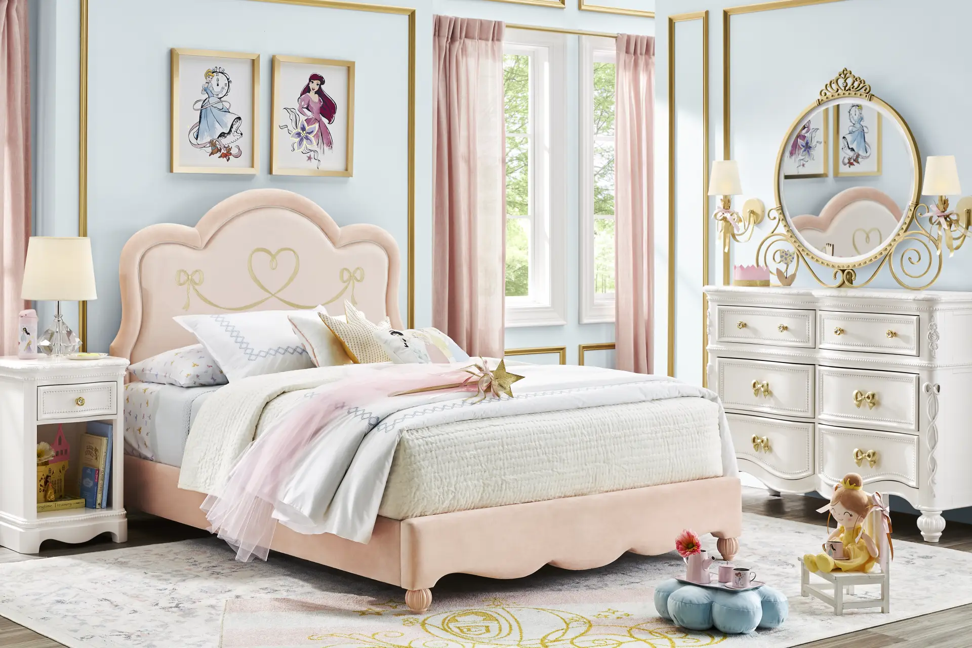 Create a fairytale escape for your little royal with the Disney Princess collection, where every night feels like a bedtime ball and every morning begins a brand-new adventure. Featuring blushing pink velvety fabric and a headboard embellished with scalloped edges and delicate gold embroidered heart and bow ribbon details, how could any growing princess resist the precious bed at the heart of this room? Pumpkin-style feet add storybook charm to its low-profile frame, grounding the look with cozy appeal. The coordinating 6-drawer dresser features gold bow and rose drawer pulls with crystal insets, soft-close glides, pink felt-lined top drawers, and built-in outlets. The matching LED-lit carriage mirror completes the dresser's sweet silhouette with fantastic flair, transforming it into a magical vanity. Control the glow with a remote or sync it to music using the Lotus Lantern app. Sparkling white finish across both pieces adds a touch of shimmer and shine to your child's space. Mattress and foundation (if required) sold separately.
