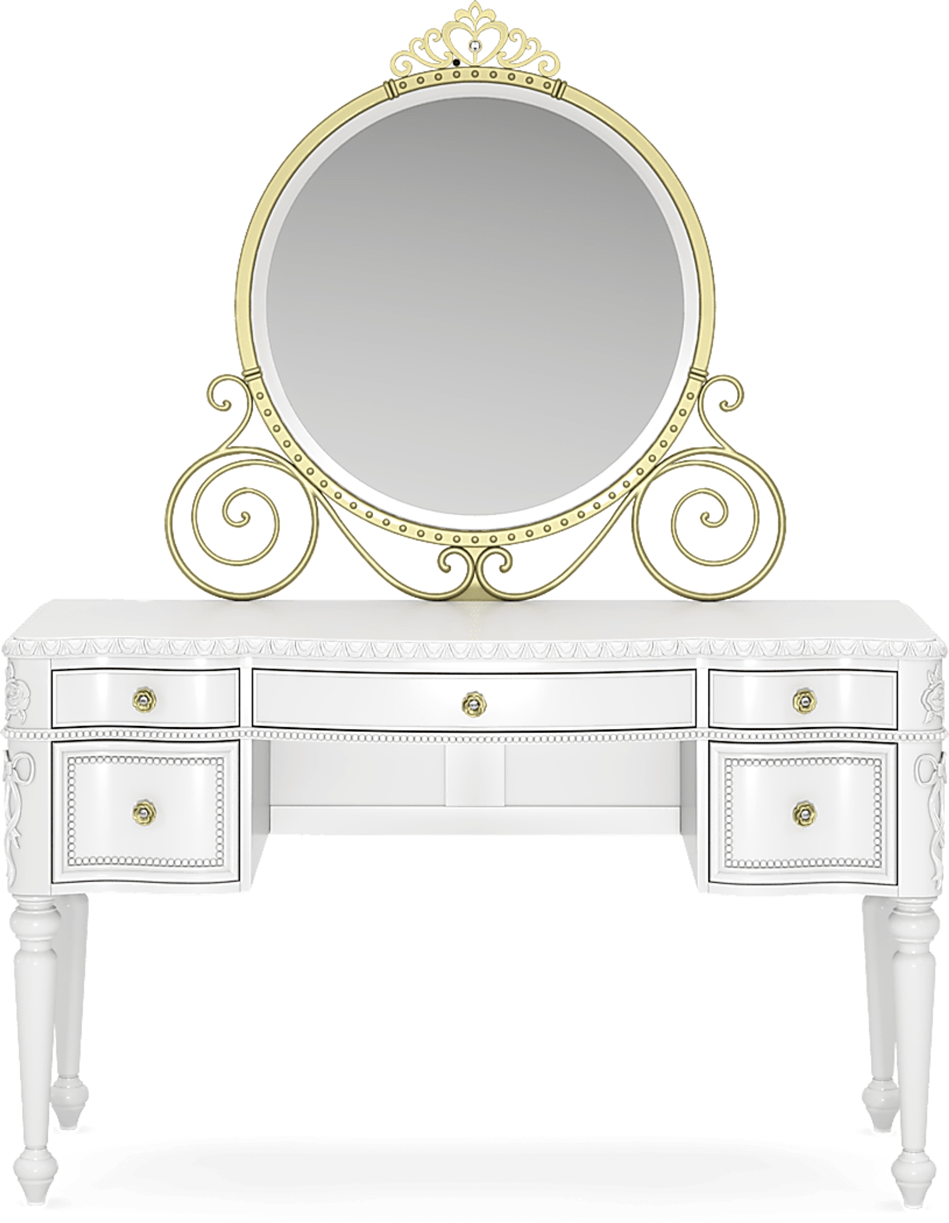 Create a fairytale escape for your little royal with the Disney Princess collection, where every night feels like a bedtime ball and every morning begins a brand-new adventure. With three drawers and a spacious work surface, the elegant desk in this set offers the perfect setting for everything from homework to coloring. The gently curved silhouette is finished in sparkle white and accented by custom gold rose drawer pulls with faux crystal insets. Featuring soft-close glides and French dovetail fronts with English dovetail backs, the drawers open smoothly and quietly. A pink felt-lined top drawer provides a soft space for special keepsakes and writing supplies, while a built-in power station with two AC outlets and dual USB ports brings modern convenience to this princess-worthy design. Paired with the LED-lit carriage mirror, this desk transforms into a magical vanity setup. Shaped like an enchanted carriage and trimmed in sparkle white, the mirror features a multicolored LED light strip that can be controlled with the included remote or the Lotus Lantern app.