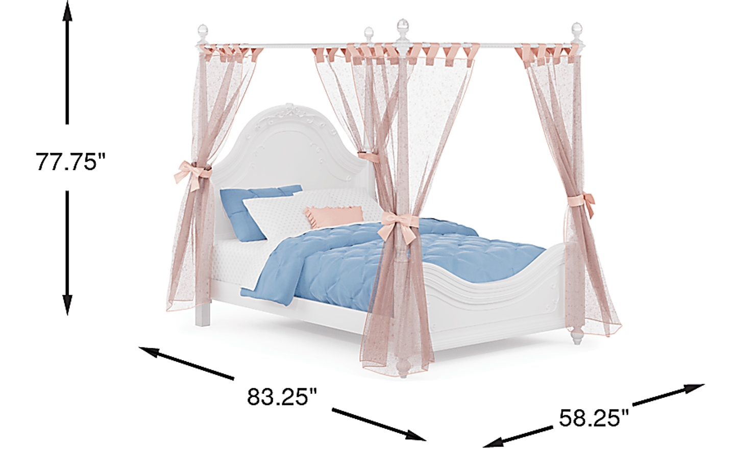 Bedtime is fit for royalty thanks to the gorgeous Disney Princess Canopy bed. Perfectly designed with a swirling ribbon motif and acrylic crystal finials topping each of the four posters, your little girl will adore this regal bed. With birch veneers in a sparkling white finish, this bed is the perfect way to settle down at the end of a long day of adventure. The pink canopy fabric finishes off the look with extra royal pizazz for the perfect princess look. Mattress and foundation (if required) sold separately.