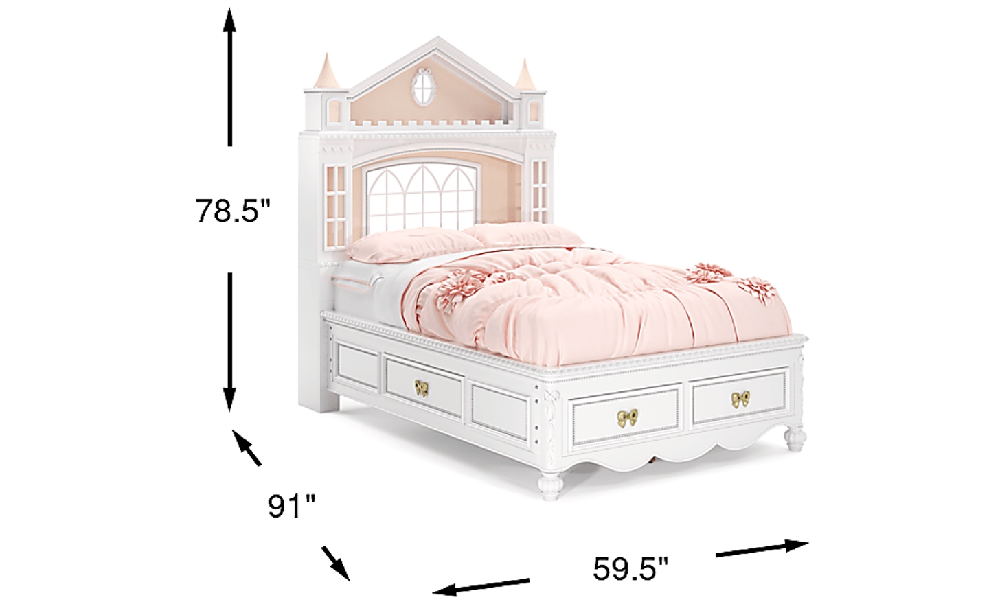 While the castle headboard is a grand focal point at 78.5 inches tall, this bed is an excellent space-saving solution for smaller rooms. By incorporating four deep drawers into the bed’s footprint, it effectively replaces the need for an additional dresser or chest. This allows you to maximize floor space for play or study areas while keeping the room organized. We recommend measuring for the 91-inch depth to ensure there is ample clearance for the footboard drawers to fully extend.
