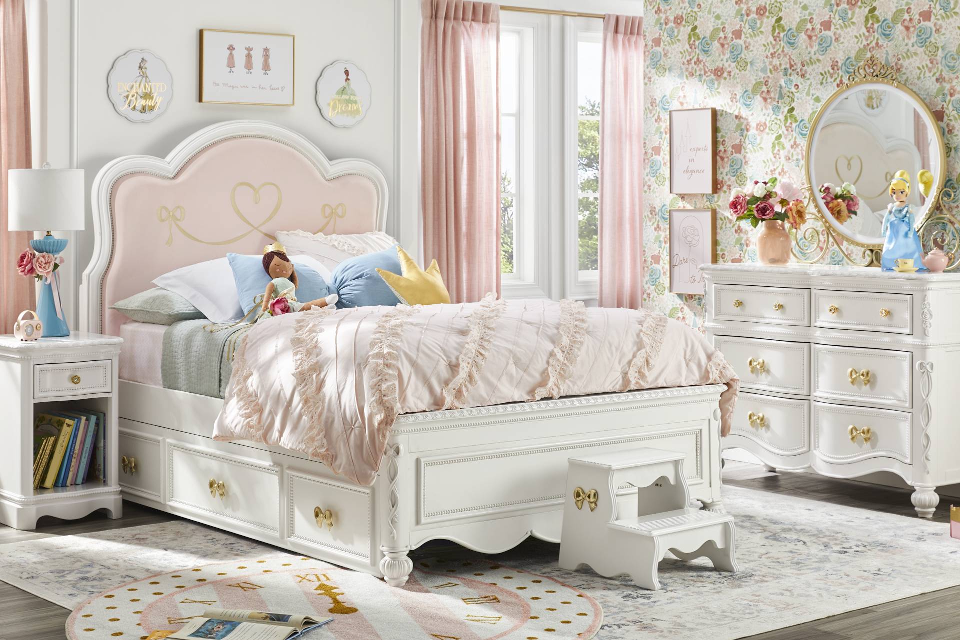 Create a fairytale escape for your little royal with the Disney Princess collection, where every night feels like a bedtime ball and every morning begins a brand-new adventure. Framed in a shimmering sparkle white finish, the bed's design balances softness with structure. Upholstered in blush pink fabric with an embroidered golden heart and bow motif, the headboard nods to classic princess elegance. Carved rose and bow accents at the footboard complete the full bed's enchanting look. The coordinating 6-drawer dresser features gold bow and rose drawer pulls with faux crystal insets, soft-close drawer glides, pink felt-lined top drawers, and built-in power outlets. The matching LED-lit carriage mirror completes the dresser's sweet silhouette with fantastic flair, transforming it into a magical vanity setup. Control the glow with a remote or sync it to music using the Lotus Lantern app. Sparkle white finish across both pieces adds a touch of shimmer and shine to your child's space. Mattress and foundation (if required) sold separately.