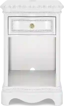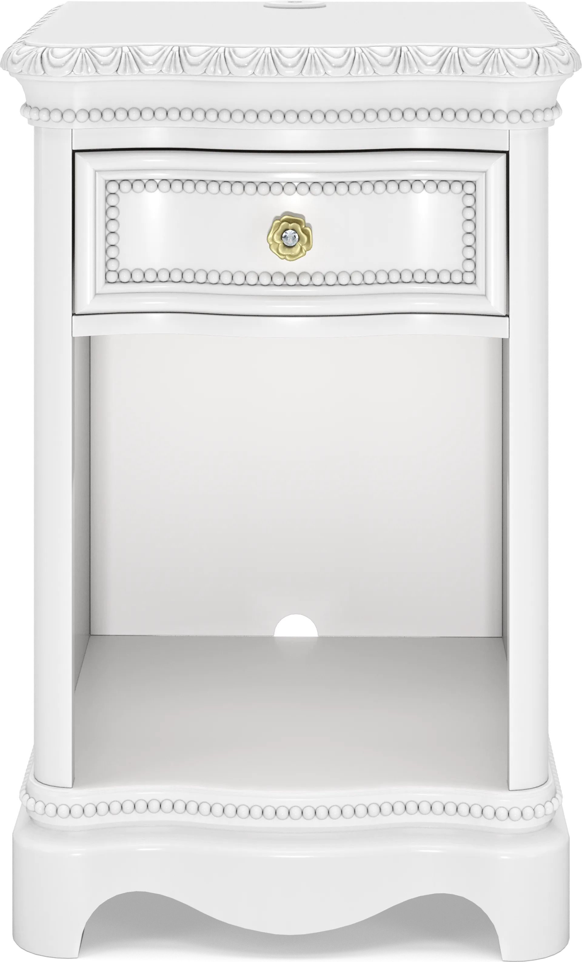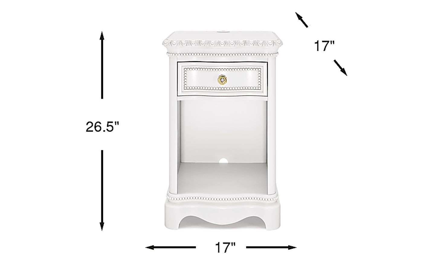 Create a fairytale escape for your little royal with the Disney Princess collection, where every night feels like a bedtime ball and every morning begins a brand-new adventure. With one drawer and an open lower cubby, this compact nightstand offers the perfect storage solution for books, bedtime treasures, keepsakes, collectibles and more. The gently curved silhouette is finished in sparkle white and accented by a custom gold rose drawer pull with a faux crystal inset. Featuring soft-close glides and French dovetail fronts and English dovetail backs, the drawer opens smoothly and quietly. A pink felt-lined interior offers a soft space for delicate items. A built-in dual USB charging station brings modern convenience to this piece, integrating everyday functionality into the princess-worthy design.