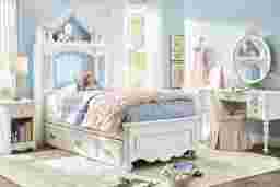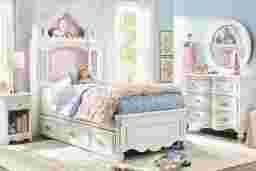 Create a fairytale escape for your little royal with the Disney Princess collection, where every night feels like a bedtime ball and every morning begins a brand-new adventure. Featuring a castle-shaped headboard with multicolor LED lights, the twin bed is the crown jewel of the room. The glow can be controlled with the included remote or synched to music through the Lotus Lantern app. Dual USB charging ports are cleverly hidden inside the headboard for added convenience. The coordinating desk includes gold bow and rose drawer pulls with faux crystal insets, soft-close drawer glides, a pink felt-lined top drawer, and a built-in power station with two AC outlets and dual USB ports. A matching carriage mirror completes the desk's sweet silhouette with fantastic flair, casting a customizable multicolor LED glow that transforms the setup into a magical vanity space. Finished in shimmering sparkle white, each piece adds storybook charm and everyday functionality to your child's space. Mattress and foundation (if required) sold separately.