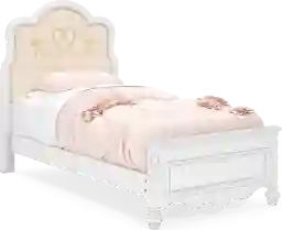 Create a fairytale escape for your little royal with the Disney Princess collection, where every night feels like a bedtime ball and every morning begins a brand-new adventure. Upholstered in blush pink fabric with a beautifully embroidered golden heart and bow motif, this headboard gives way to a bed crafted with an iconic nod to classic princess elegance. Framed in a shimmering sparkle white finish, the design balances softness with structure, while carved rose and bow details at the footboard complete the enchanting look. Mattress and foundation (if required) sold separately.