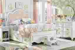 Create a fairytale escape for your little royal with the Disney Princess collection, where every night feels like a bedtime ball and every morning begins a brand-new adventure. Framed in a shimmering sparkle white finish, the bed's design balances softness with structure. Upholstered in blush pink fabric with an embroidered golden heart and bow motif, the headboard nods to classic princess elegance. Carved rose and bow accents at the footboard complete the twin bed's enchanting look. The coordinating 6-drawer dresser features gold bow and rose drawer pulls with faux crystal insets, soft-close drawer glides, pink felt-lined top drawers, and built-in power outlets. The matching LED-lit carriage mirror completes the dresser's sweet silhouette with fantastic flair, transforming it into a magical vanity setup. Control the glow with a remote or sync it to music using the Lotus Lantern app. Sparkle white finish across both pieces adds a touch of shimmer and shine to your child's space. Mattress and foundation (if required) sold separately.