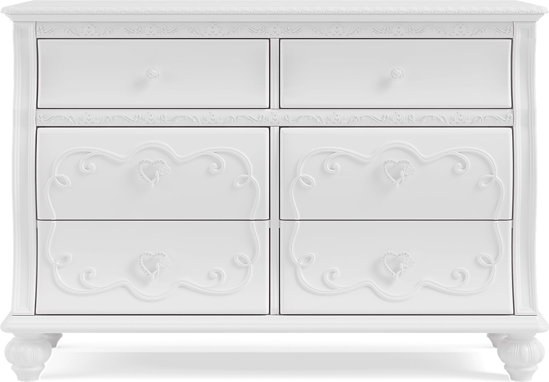 Store her gowns and other clothing in the gorgeous Disney Princess dresser. This wonderful piece is crafted with birch veneers complete with a sparkling white finish befitting royalty. A swirling ribbon design and acrylic crystal heart-shaped pulls on the bottom four drawers adds an elegant flair to this dresser while the rose-shaped pulls of the top two drawers add a classic flair to coordinate with other aspects of this collection. A stunning crystalline bead inlay with pumpkin carriages is the perfect finishing touch to this magical dresser.