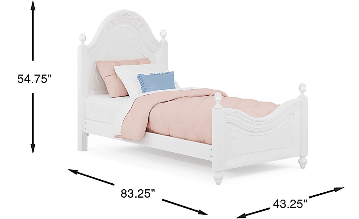 Send your child off to sleep with the regal Disney Princess panel bed. Elegantly appointed with a swirling ribbon design and acrylic crystal finials on the four posts, this bed truly is fit for your little princess. Crafted with birch veneers and a sparkling white finish, this bed has all the style a princess deserves without sacrificing on quality. Mattress and foundation (if required) sold separately. Bed shown is full size.